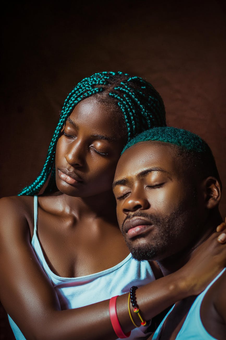 blue and brown portrait of a couple with closed eyes